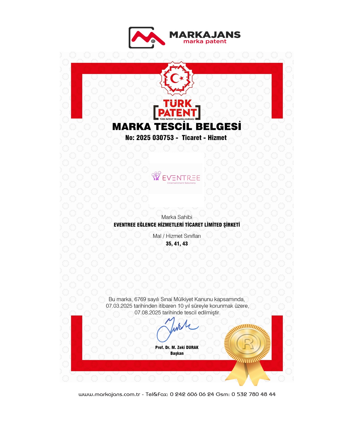EVENTREE Eğlence Hizmetleri Ticaret Limited Şirketi, Türkiye Patent ve Marka Kurumu tarafından resmi olarak tescil edilmiş bir markadır. 07 Ağustos 2025 tarihinde tescil edilen markamız, Ticaret - Hizmet alanında, Sınıflar 35, 41 ve 43 kapsamında korunmaktadır.